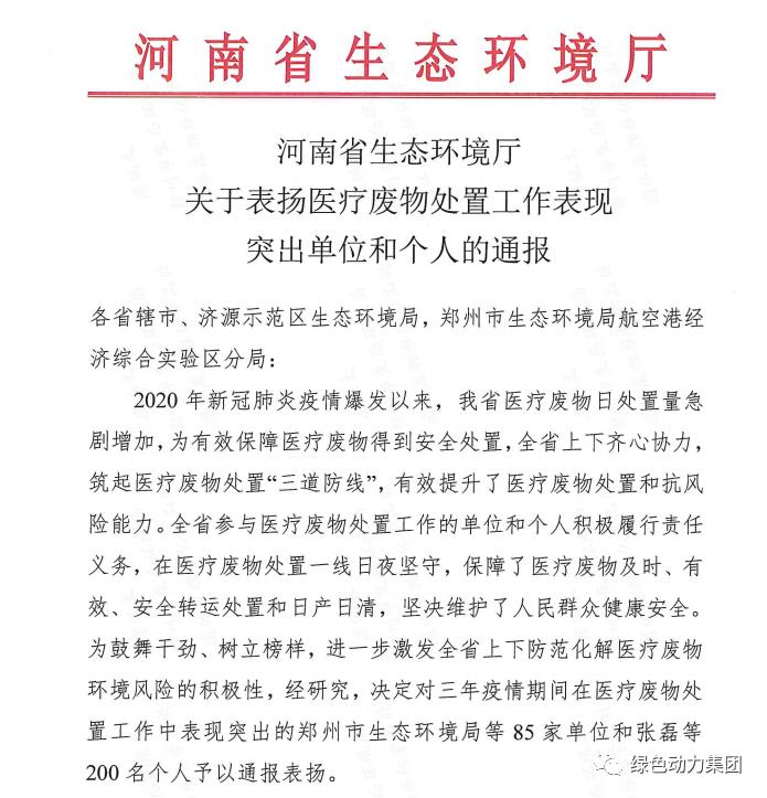 2月,集团下属登封公司总经理宦秀忠因在疫情期间带领登封公司积极投身河南省郑州市疫情防控工作,讲奉献、显担当,被河南省生态环境厅评为“医疗废物处置工作表现突出个人”。